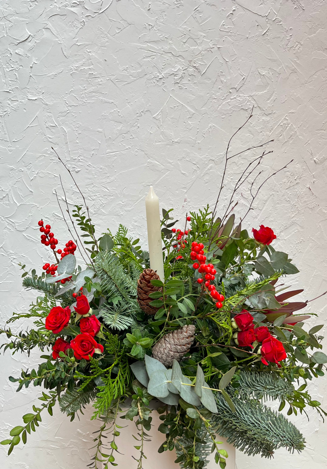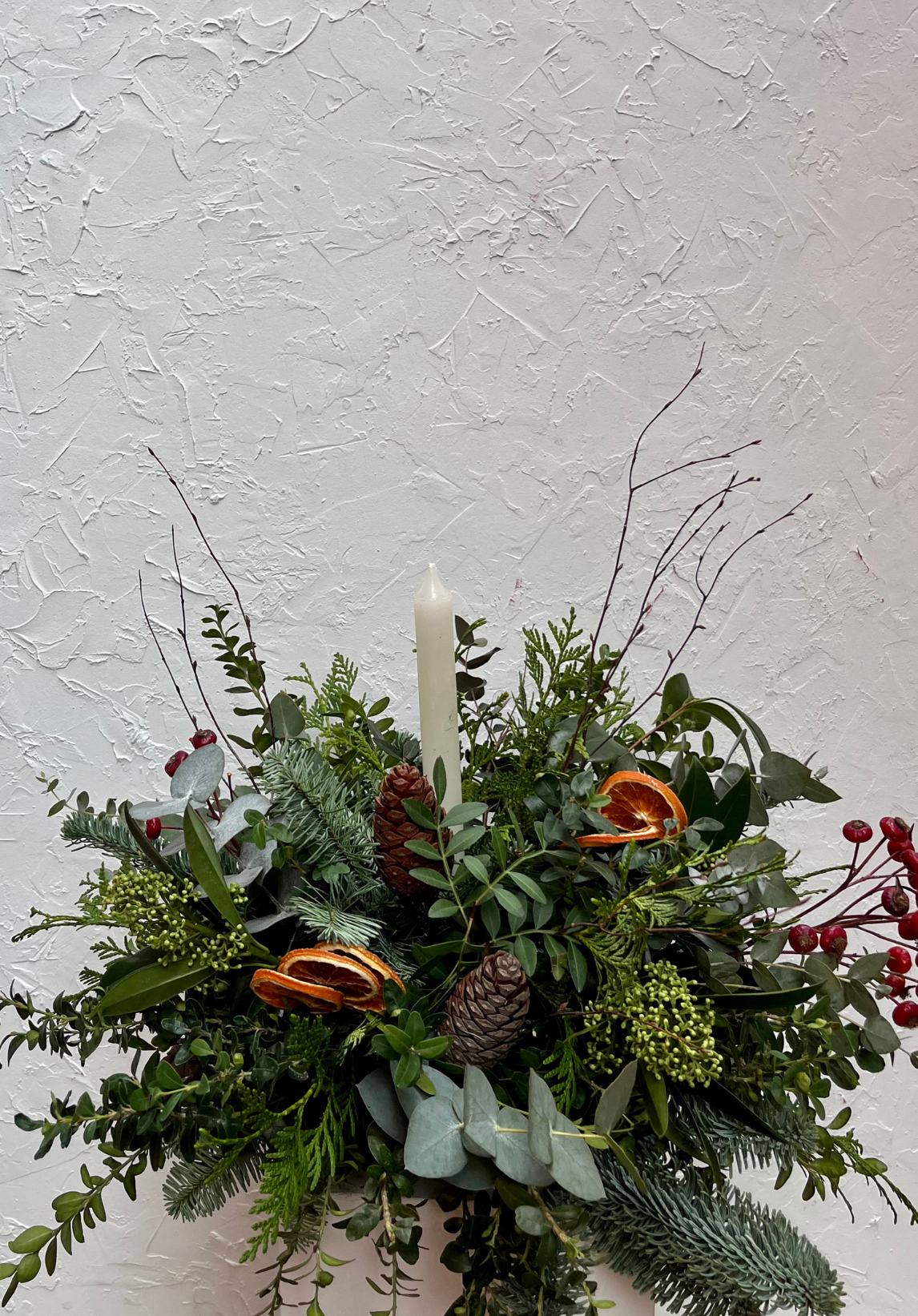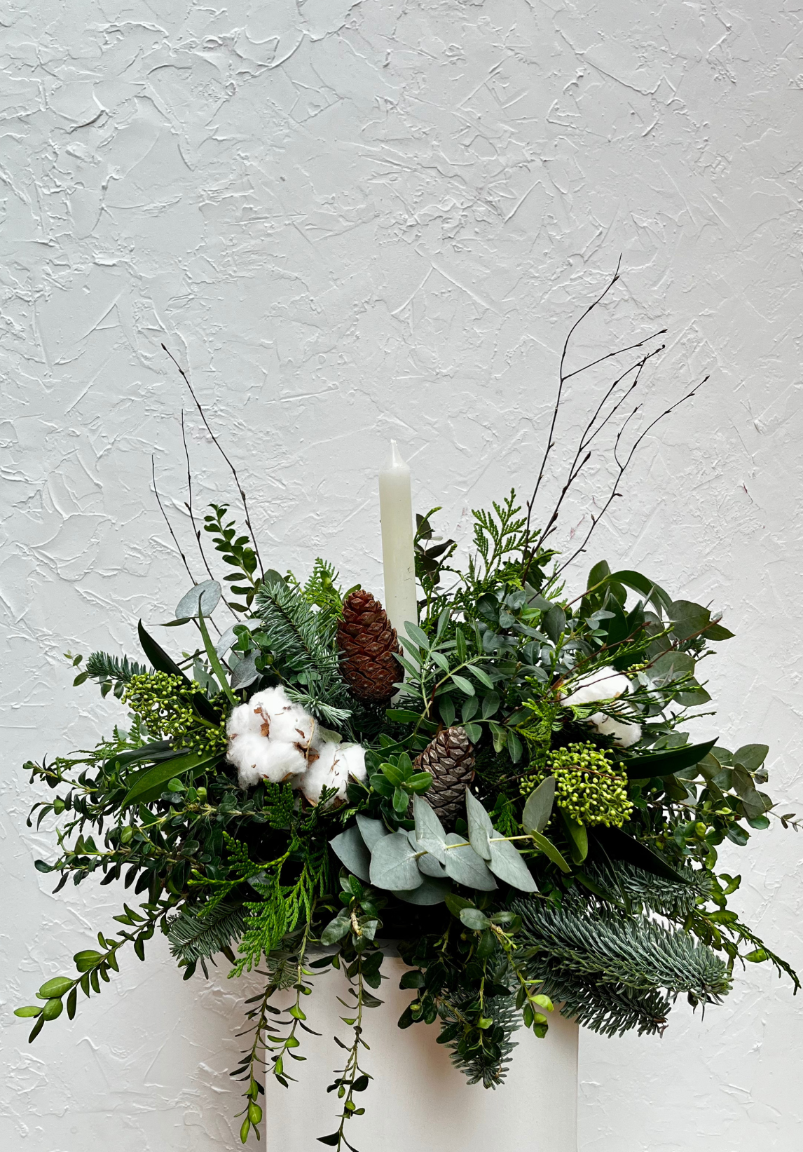 Centro de mesa de navidad. confeccionado con verdes variados y flores navideñas con una vela en centro.